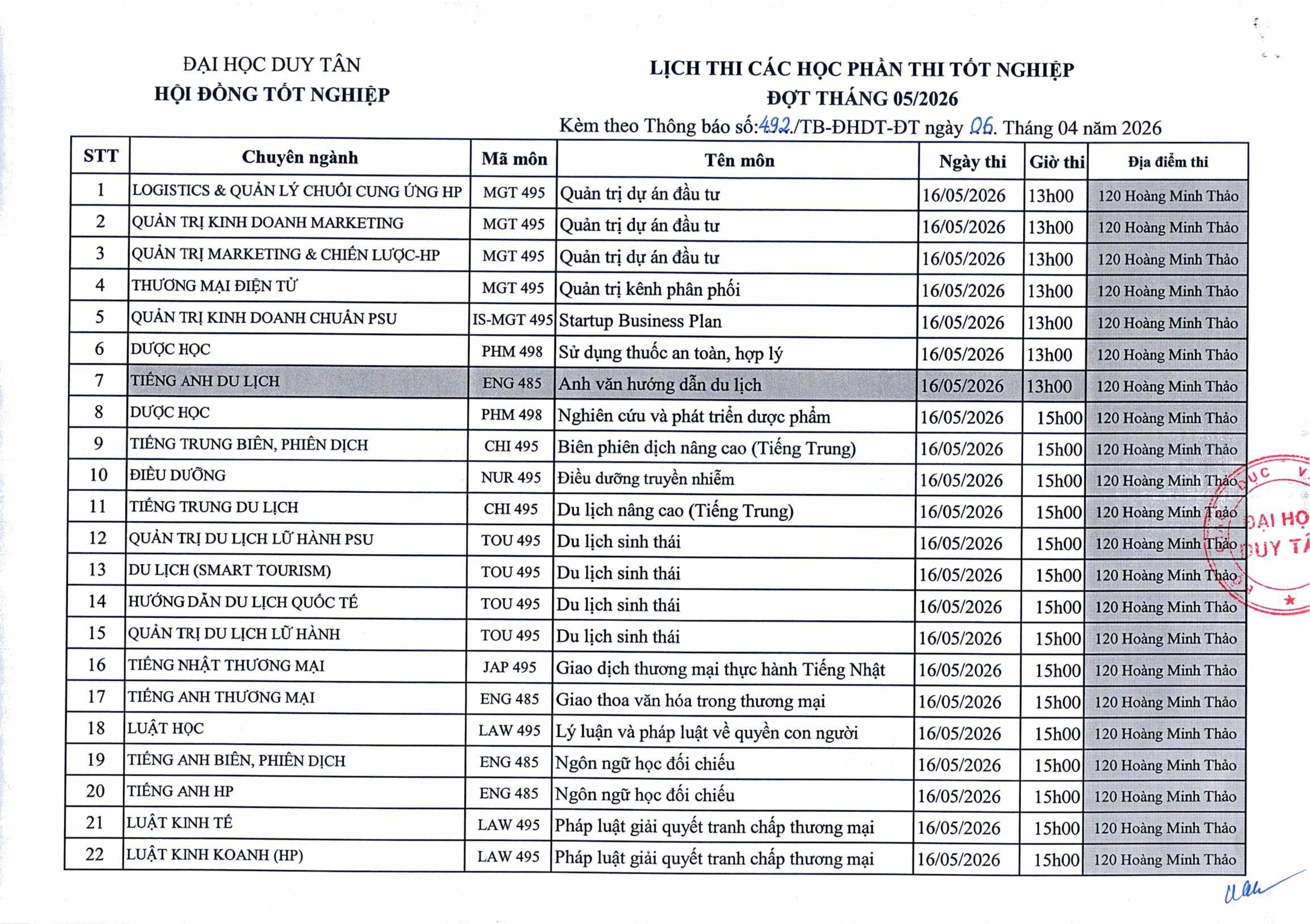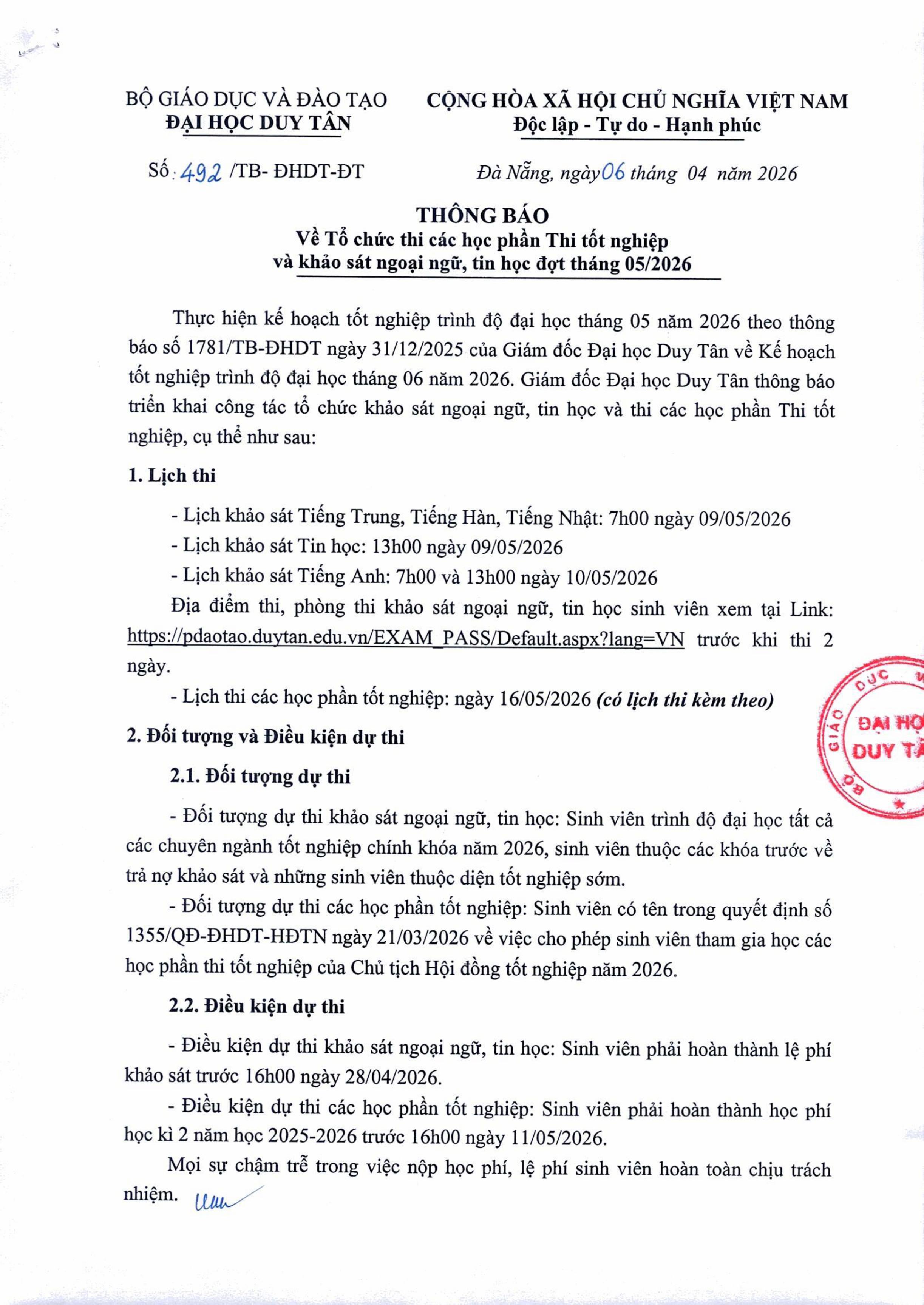 Thông báo Về Tổ chức thi các học phần Thi tốt nghiệp và khảo sát ngoại ngữ, tin học đợt tháng 05/2026