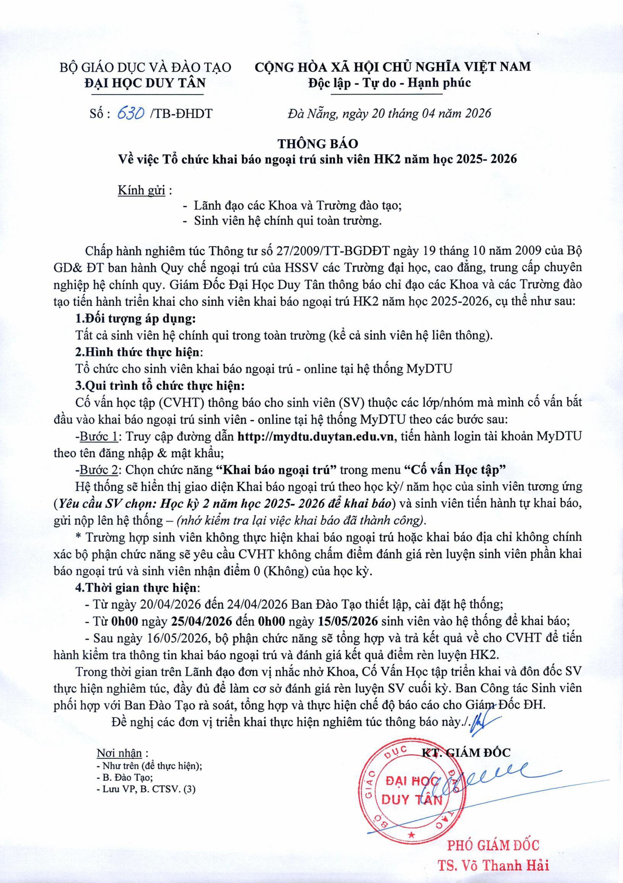 Thông báo Về việc Tổ chức khai báo ngoại trú sinh viên HK2 năm học 2025-2026