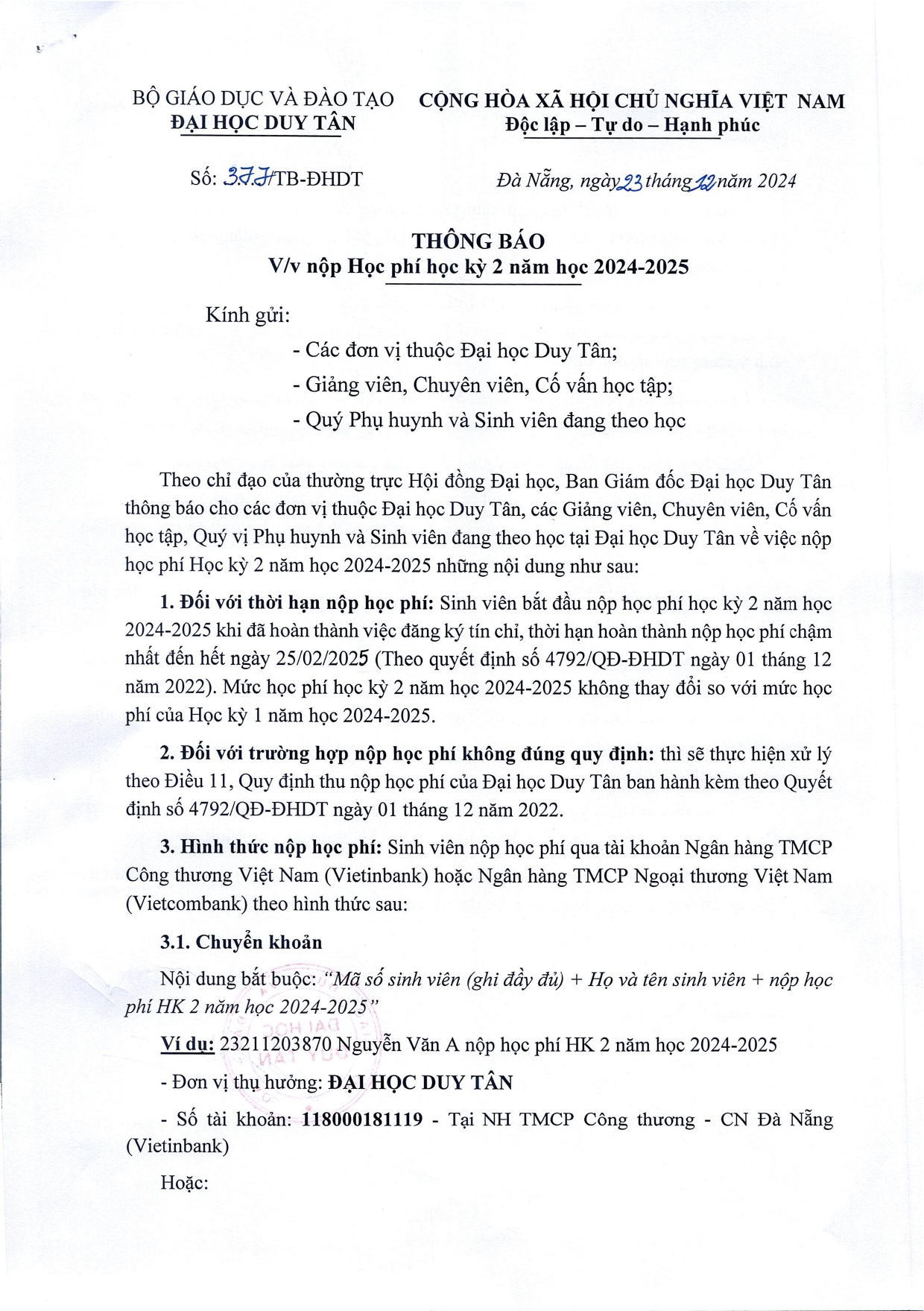 THÔNG BÁO V/V NỘP HỌC PHÍ HỌC KỲ II NĂM HỌC 2024-2025