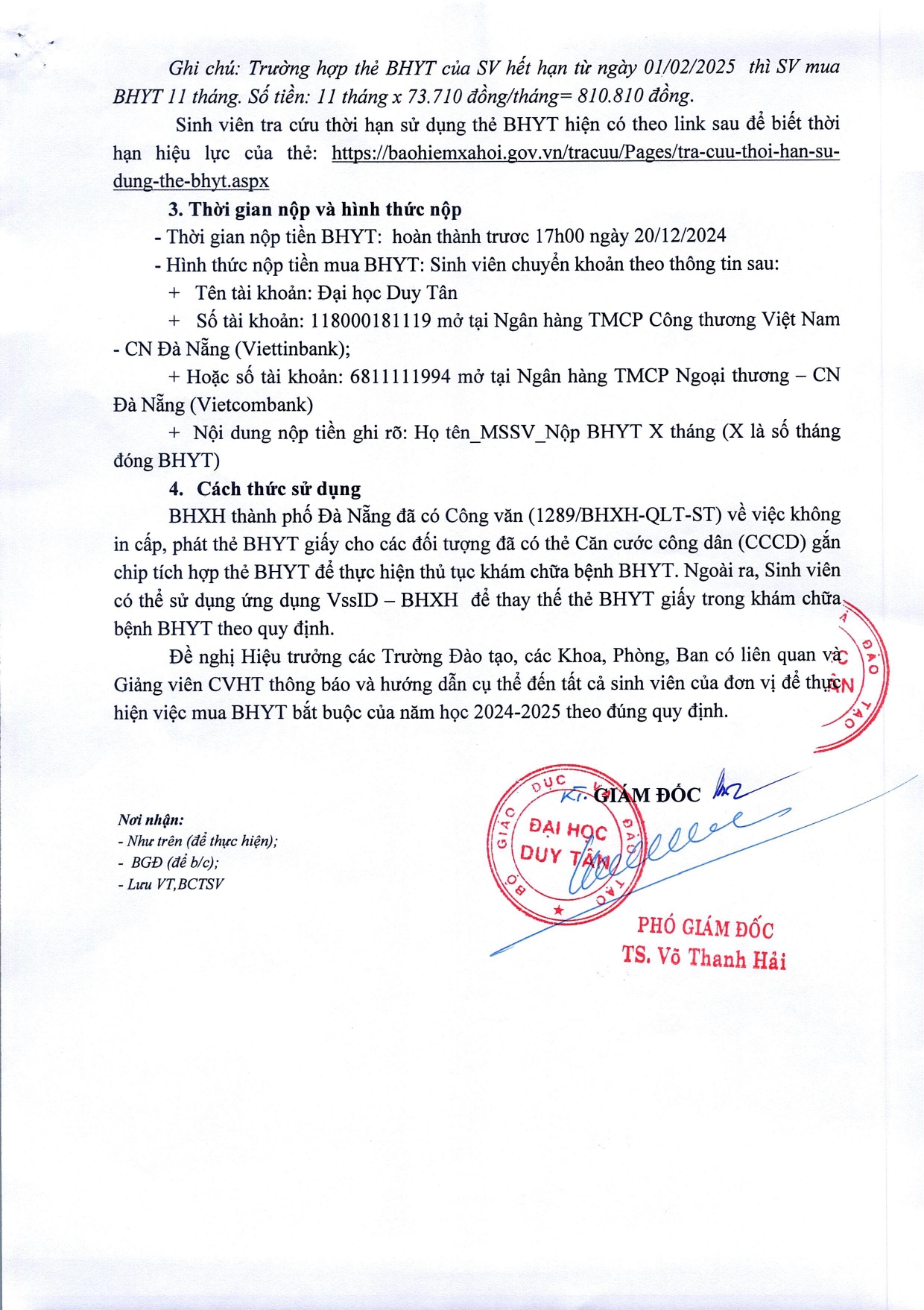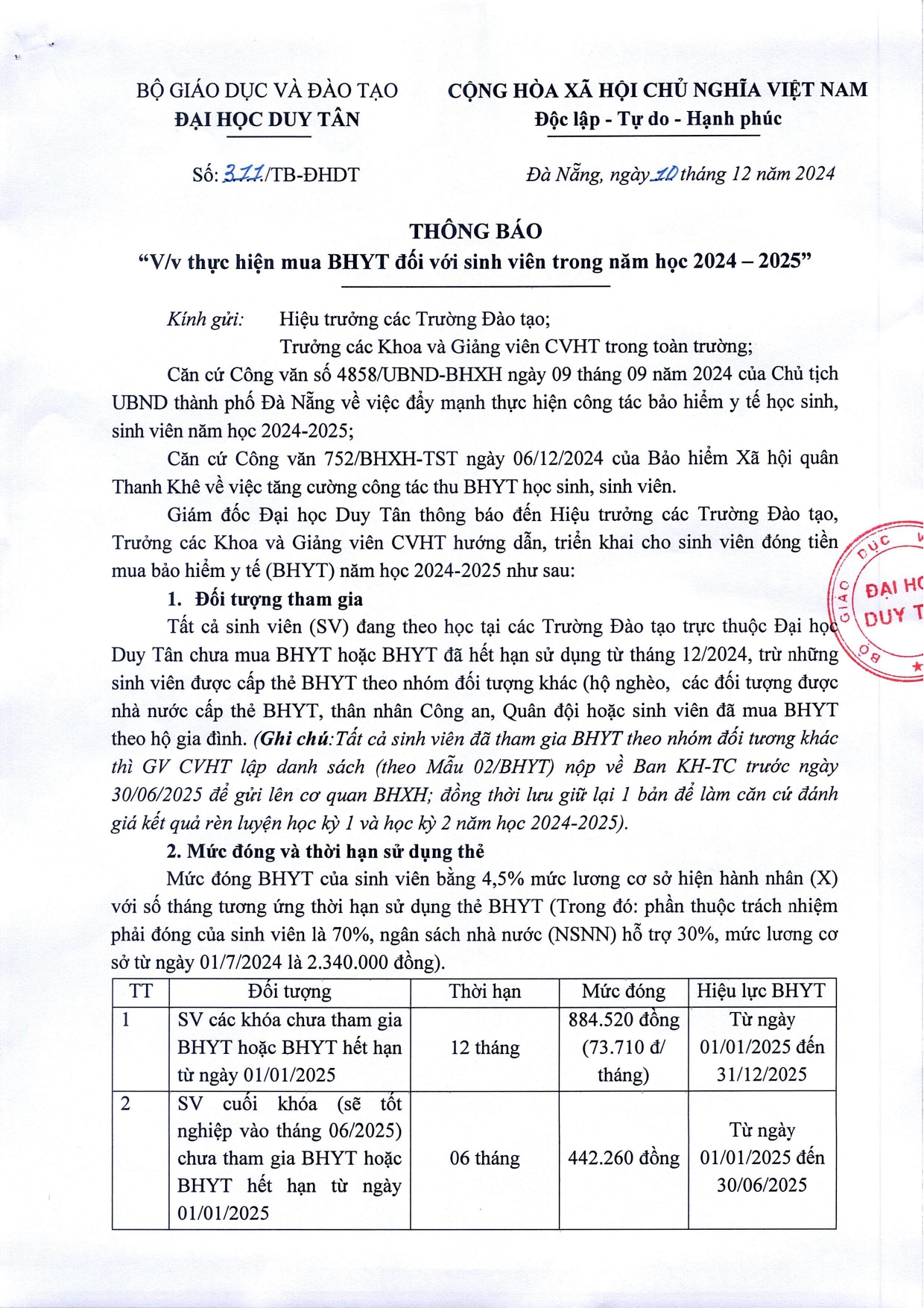 Thông Báo V/v thực hiện mua BHYT đối với sinh viên trong năm học 2024-2025