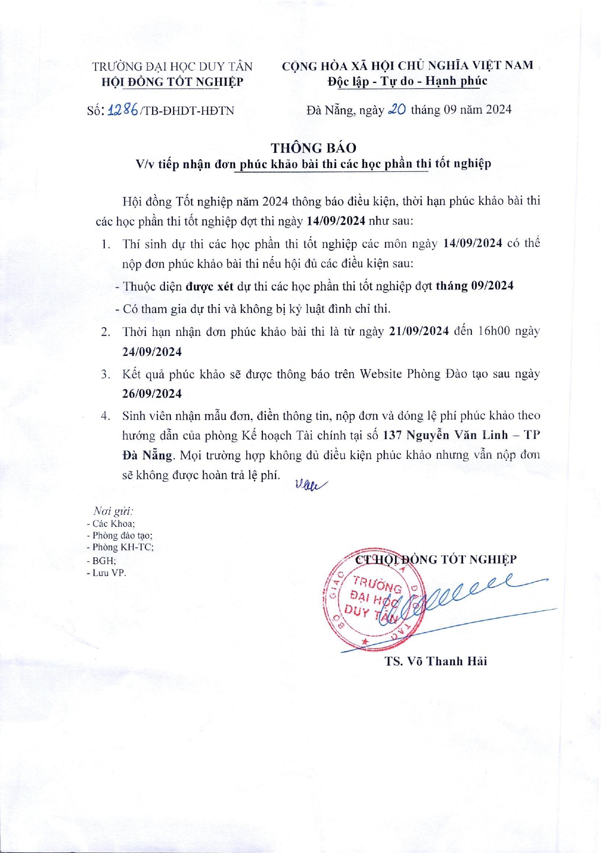 THÔNG BÁO V/V TIẾP NHẬN ĐƠN PHÚC KHẢO BÀI THI CÁC HỌC PHẦN THI TỐT NGHIỆP ĐỢT THI NGÀY 14/09/2024