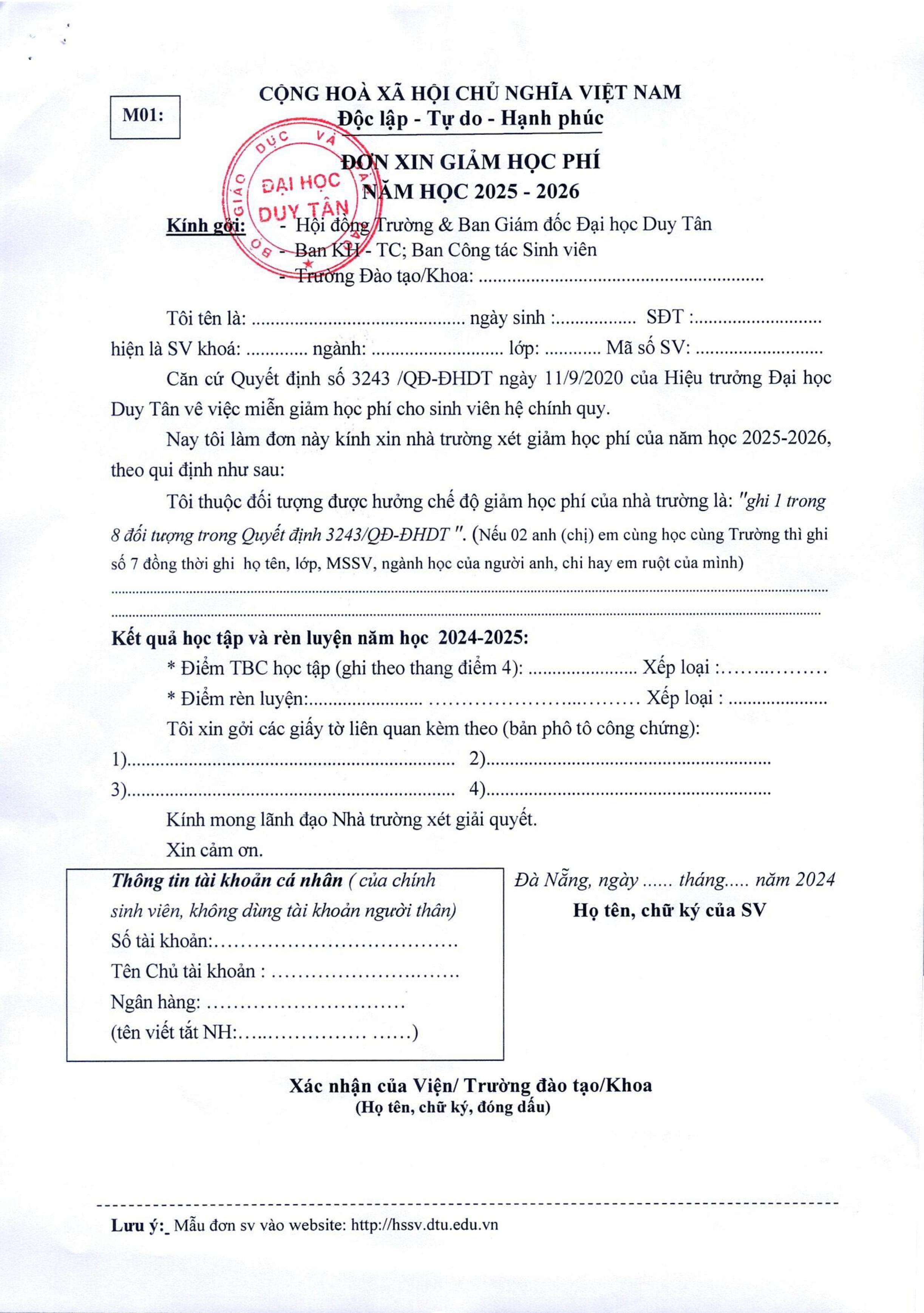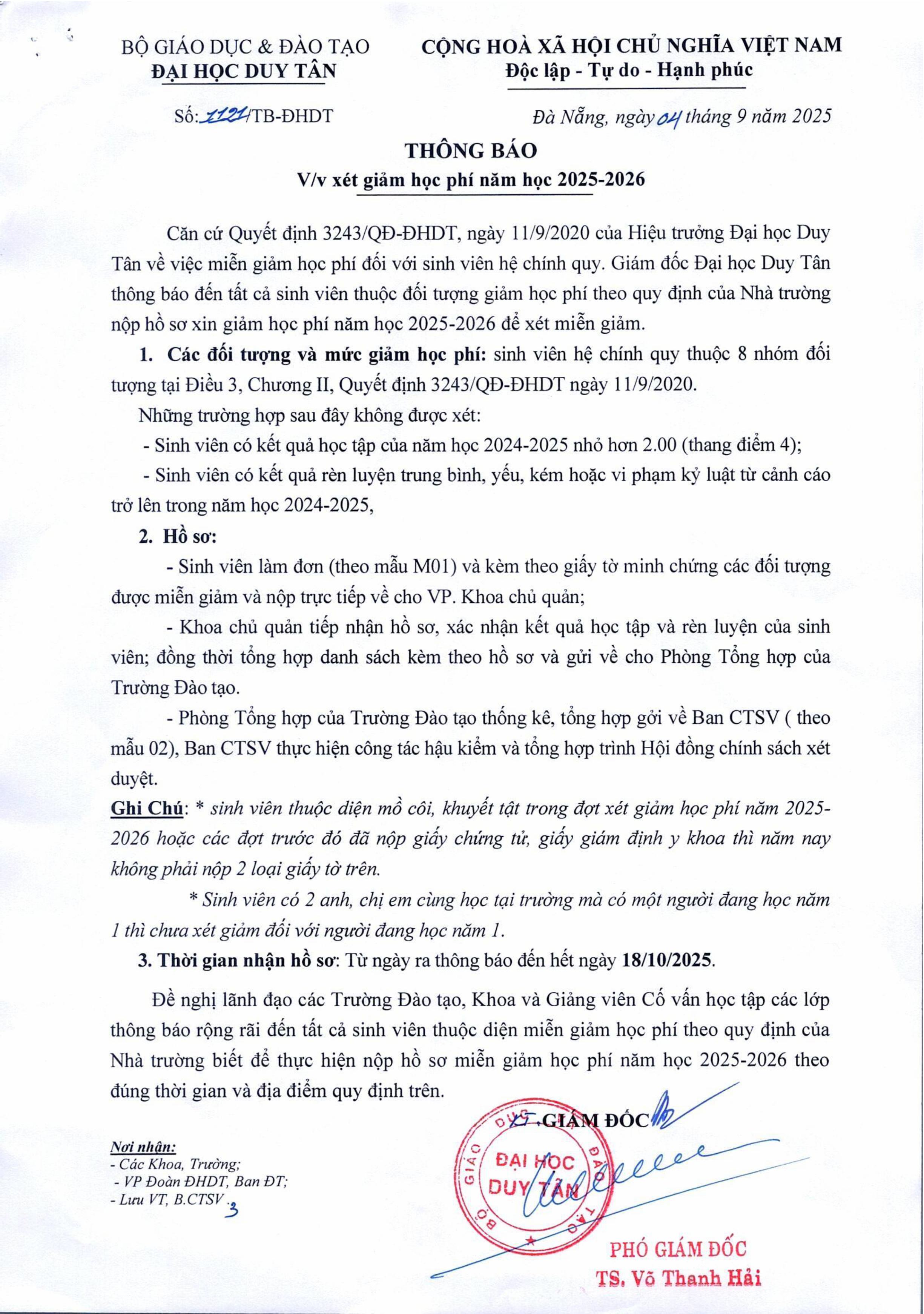 Thông báo V/v xét giảm học phí năm học 2025-2026