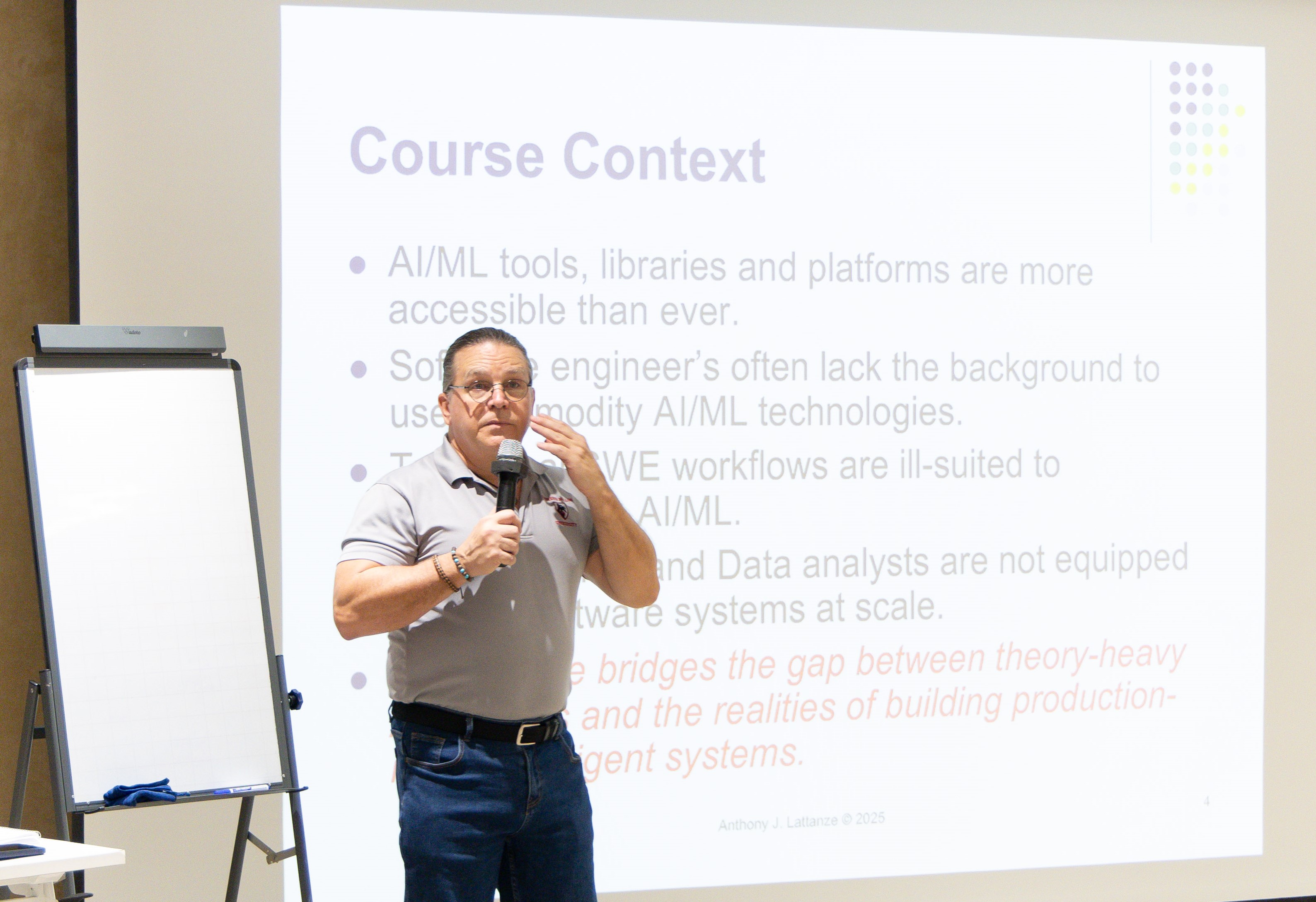 Trực tiếp giảng dạy là Giáo sư Anthony (Tony) J. Lattanze , một chuyên gia hàng đầu trong lĩnh vực Kỹ thuật Hệ thống Phần mềm và Khoa học Máy tính. Với bề dày kinh nghiệm thực tiễn trong việc phát triển các ứng dụng công nghiệp, ông từng giữ cương vị Giám đốc các chương trình Kỹ thuật Phần mềm Chuyên nghiệp tại Viện S3D (tiền thân là Viện Nghiên cứu Phần mềm - ISR) thuộc Đại học Carnegie Mellon (CMU). Đây là đơn vị đào tạo Công nghệ thông tin danh giá nhất thế giới, nơi Giáo sư Lattanze đã góp phần định hình các tiêu chuẩn kỹ thuật phần mềm hiện đại, đặc biệt là trong việc tích hợp các công nghệ AI ứng dụng vào hệ thống thực tế.