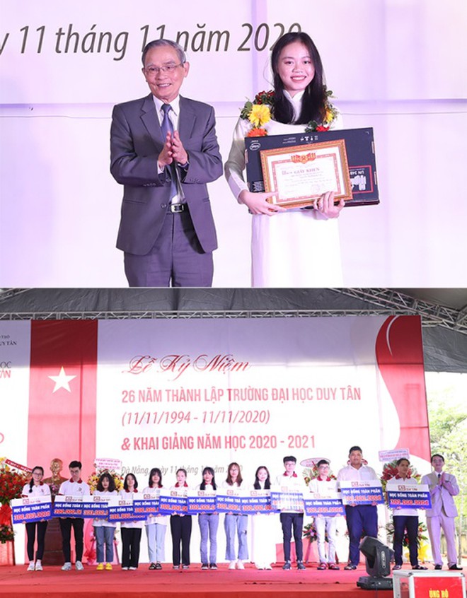AHLĐ, NGƯT Lê Công Cơ - Chủ tịch Hội đồng Trường ĐH Duy Tân trao Học bổng Toàn phần cho Thủ khoa Nguyễn Thị Khánh Chi đạt 28/30 điểm (ảnh trên) và TS Lê Nguyên Bảo - Hiệu trưởng DTU trao các Học bổng Toàn phần tại lễ Khai giảng